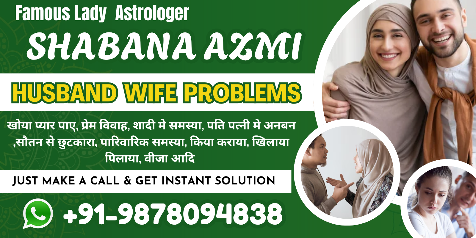 प्रेम विवाह, शादी में समस्या, ग्रह क्लेश, पति पत्नी में अनबन, सौतन से छुटकारा, पारिवारिक समस्या, किया कराया, खिलाया पिलाया, बचपन का प्यार, वीजा, विदेश यात्रा, खोया प्यार वापस पाएं, सास को काबू करना, प्यार में धोखा खाए प्रेमी प्रेमिका एक बार अवश्य संपर्क करें +91-9878094838